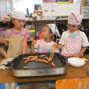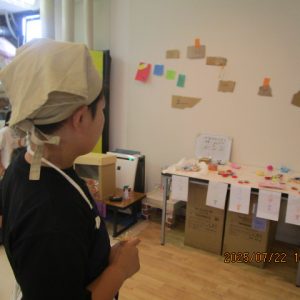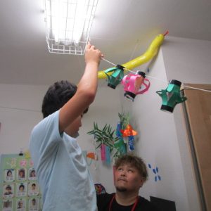 今年はよりお祭りっぽい雰囲気を味わってほしくてちょうちんもたくさん。花火の壁面も…。みんなで飾りつけを頑張りました。屋台のメニューもお祭りにちなんだものを作りました。