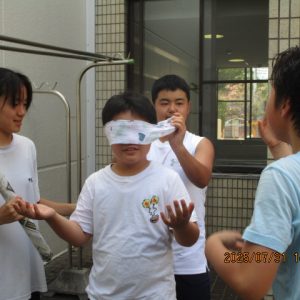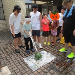 誘導する人が、スイカを割る人の近くに立ち、肩を触って、進む方向や停止を伝える…と決めました。